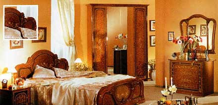 Стоимость набора 73 510 руб. Полки 3шт. к 2дв.шкафу 1 230 руб. Тумба 2ящ. 4 740 руб. x 2 шт. Кровать 2спальная (дерев.рамка) 22 190 руб. Комод 4ящ. 8 150 руб. Зеркало навесное 7 250 руб. Шкаф 4дв. (2+2) с 2зеркалами 25 210  руб.   • Текстура: радика фигурато корень • Фасад: шелкография глянцевый лак При создании спальни акцент был сделан на богатом убранстве, пышном декоре в традициях Византийских мастеров. Набор мебели «Флоренция» идеально подходит для создания интерьера парадной спальни. Эта спальня полностью оправдывает свое название. Роскошь, витиеватые формы, замысловатый рисунок, глянцевый блеск… Италия никогда не выходит из моды. Изголовье украшено имитацией резьбы по дереву. Все фасады спальни украшены рисунком и покрыты лаком, что обеспечивает особую долговечность. Кровать по желанию комплектуется подкроватными выкатными ящиками.