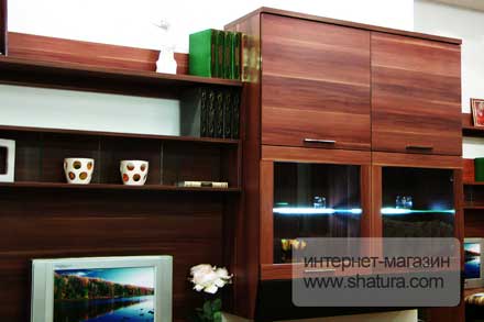 Фасад: «Слива Валлис» + Венге. Особенности Alice: • Модульная мебель • Возможность составления как легких композиций с навесными модулями, так и больших композиций с прямыми и угловыми шкафами, витринами • Наличие низких и высоких тумб под TV аппаратуру • Полка под CD/DVD диски, подставка под TV аппаратуру со стеклянными элементами • Наличие отдельностоящих высоких комодов с витриной и ящиками • На ящиках тумб и витринах декоративный профиль МДФ с фрезеровкой • Стеклянные фасады в профиле МДФ в текстуре • Дополнительная подсветка стеклянных полок