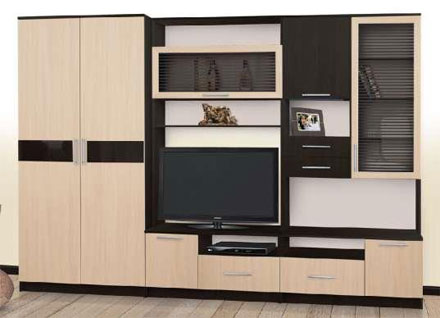 Современная мебельная стенка для гостиной. Удобная и очень вместительная. Большой и удобный шкаф для одежды, полки для посуды и книг, ящики для белья.